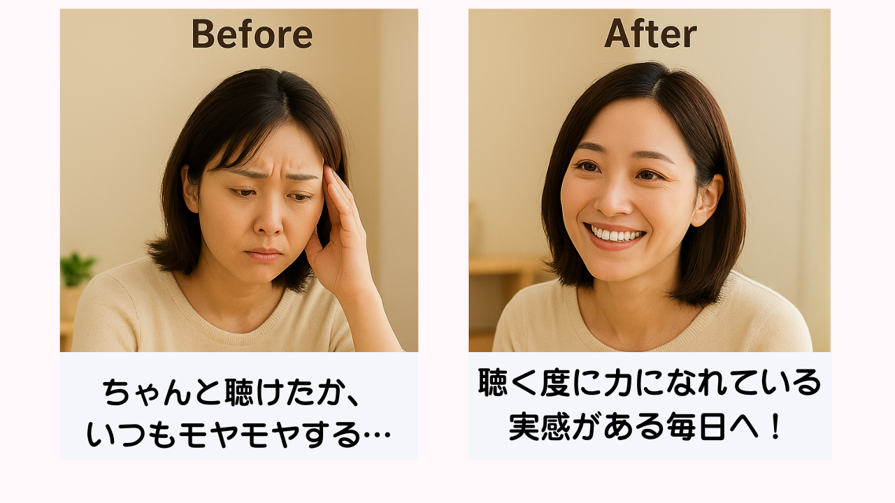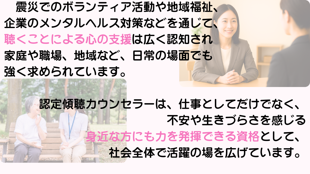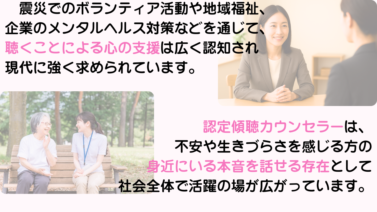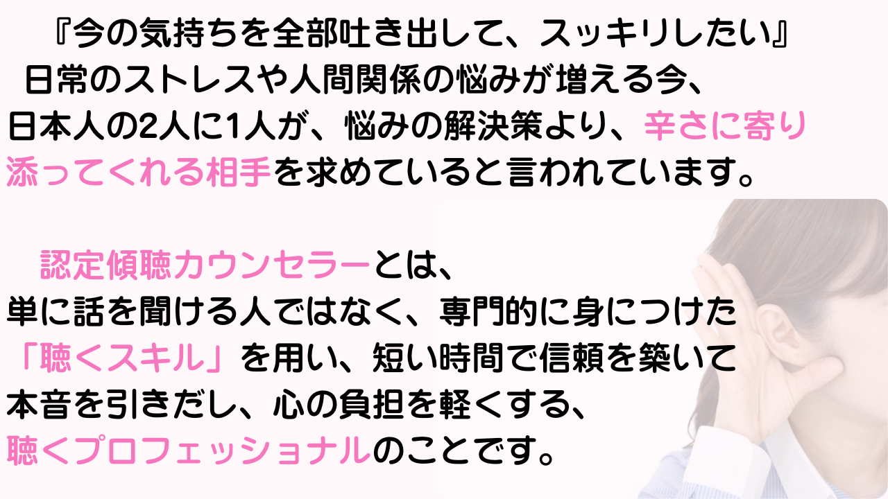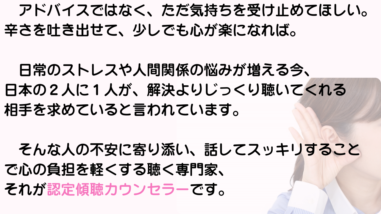 あなたが話を聴くだけで、これからどれだけ多くの不安を希望に変えていくことができるでしょう。あなたの聴く力が、日本に笑顔をもたらします。