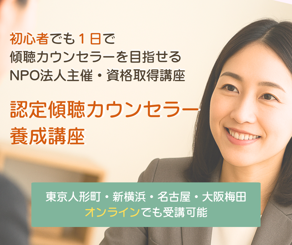 あなたが話を聴くだけで、これからどれだけ多くの不安を希望に変えていくことができるのでしょう。あなたの聴く力が、日本に笑顔をもたらします。