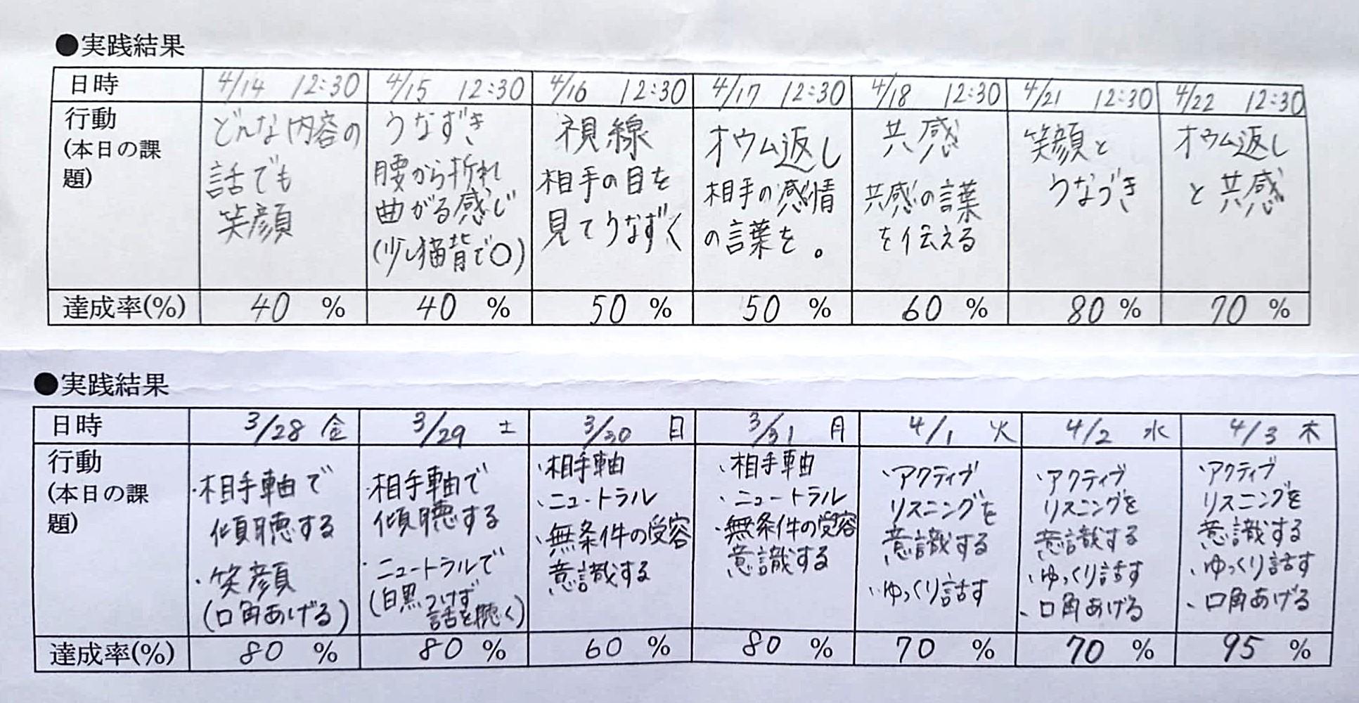 学んですぐ実践しました。1,2日はぎこちなかったですが、5日目くらいに「ちゃんと聴いてくれてありがとう、分かってくれてうれしい」と言われるように。1日の学びでの変化を実感しています!